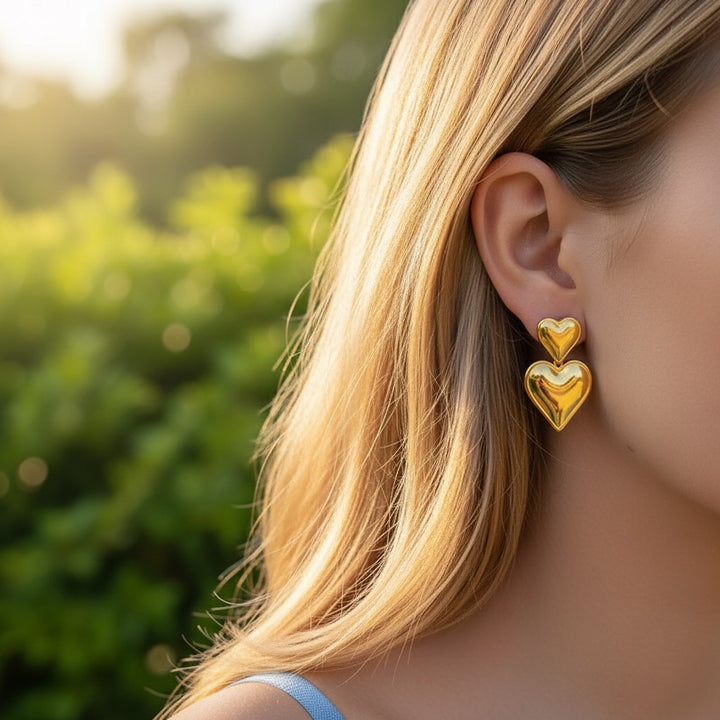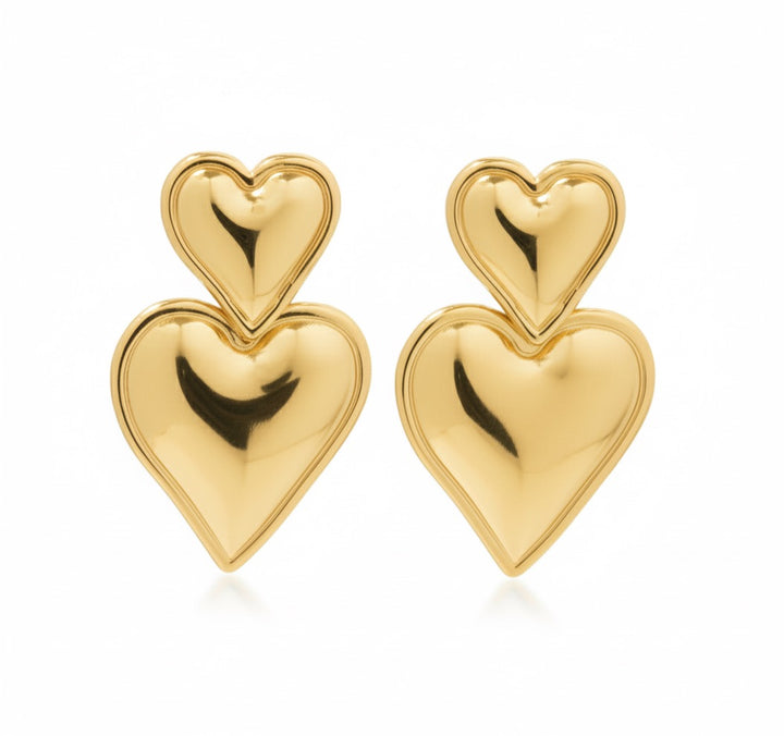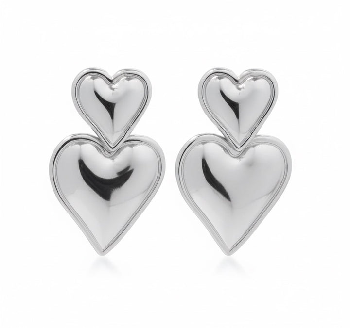 These earrings feature a charming double drop design, with two delicate heart-shaped elements that gracefully sway and catch the light with every movement. Whether worn for a special occasion or as an everyday accessory, these earrings are playful and fun yet sophisticated and elegant.