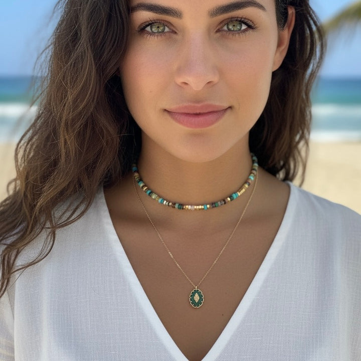 Natural Gemstones: Each necklace is completely unique, threaded with pieces of Malachite, Moonstone, Garnet, Crystal Apatite, Amethyst, Amazonite, Rose Quartz, Turquoise, Orange Carnelian, Pink Opal, Green Onyx, Lemon Quartz, Blue Lace Agate, Peruvian Opal,Lapis, Tourmaline,Rhodonite and Blue Quartz