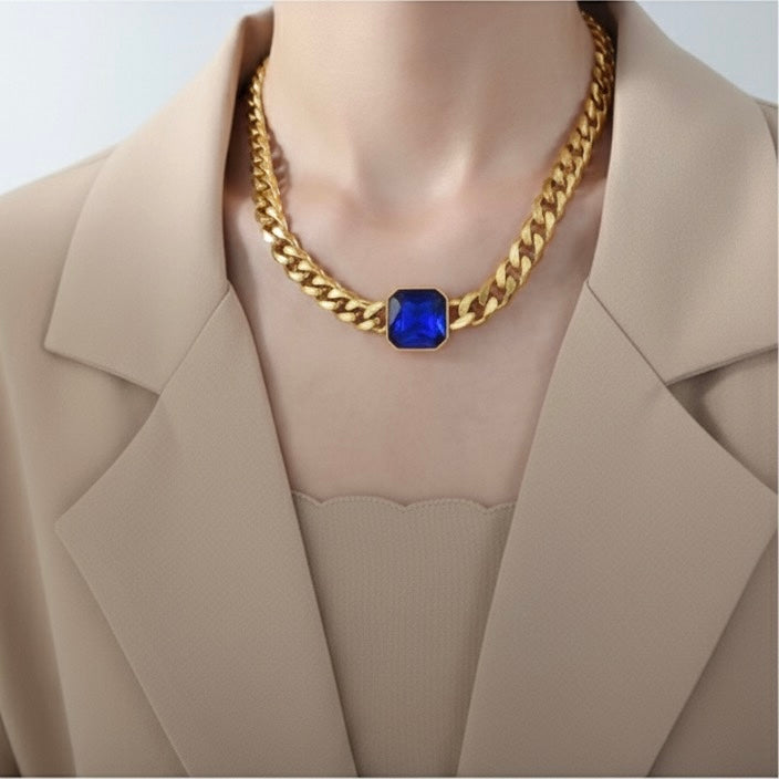Elevate your look with this bold, statement piece. Crafted from premium stainless steel and finished in durable 24K PVD gold plating, this chunky chain necklace features a brilliant simulated sapphire-blue stone that catches the light beautifully from every angle.