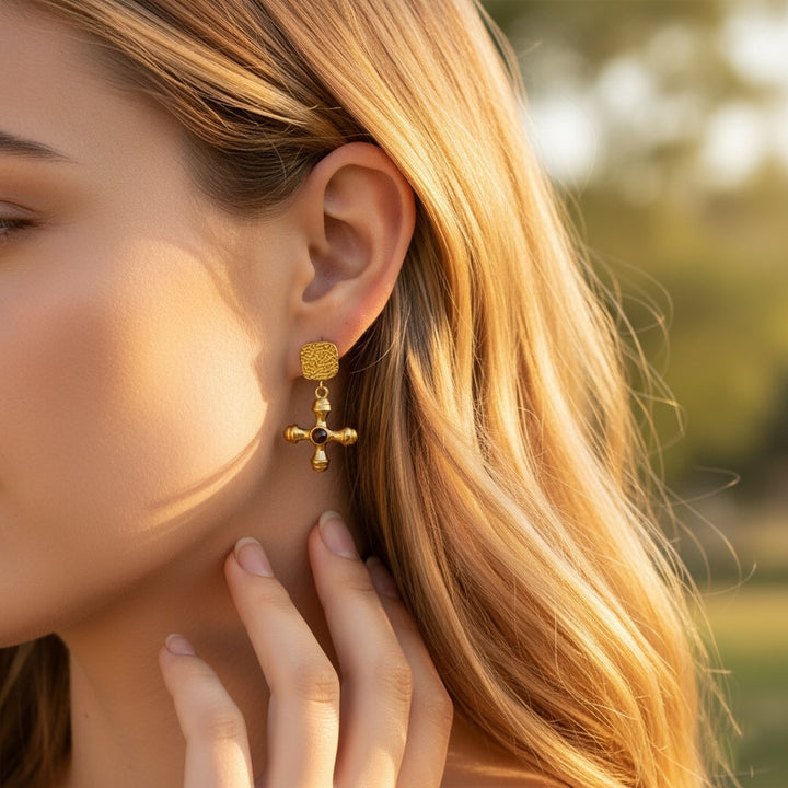 Elevate your style with our vintage-inspired cross earrings featuring stunning tiger's eye centrepiece. Shop now!