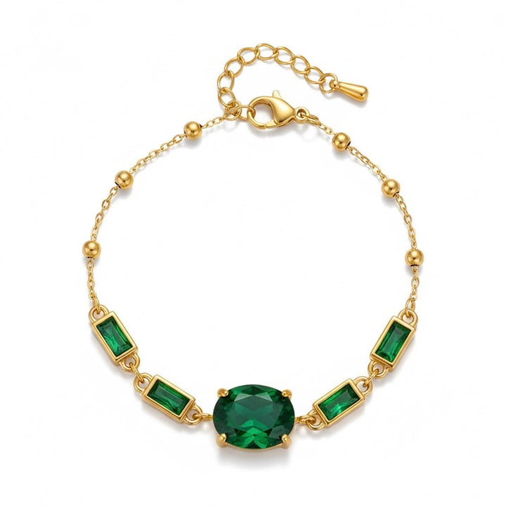 Add a pop of color to your jewelry collection with our simulated emerald bracelet. Perfect for any occasion, this piece is sure to turn heads.