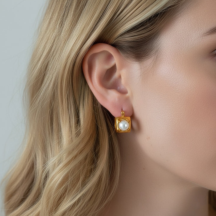 These earrings feature a sleek and modern U-shaped design, at the heart of each earring is a glass bead that beautifully mimics the lustrous appearance of a pearl.