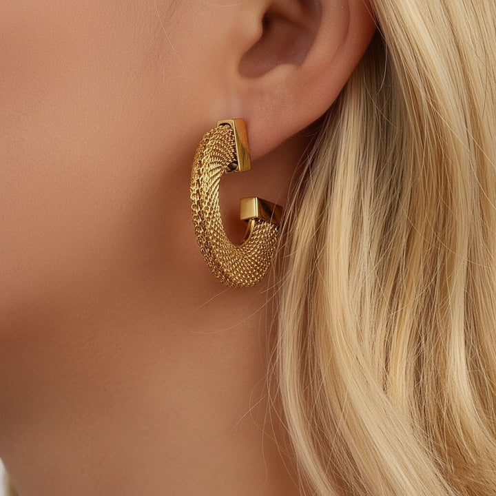 These earrings feature a distinctive netted texture that brings a touch of depth and visual interest to the timeless hoop design.