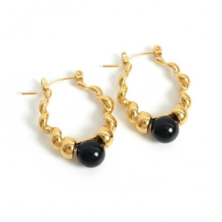 Add a touch of elegance to your look with these trendy twist hoop earrings featuring a chic black sphere. Perfect for any occasion!