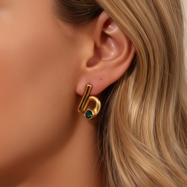 Each earring showcases a meticulously crafted mini abstract cactus shape, capturing the whimsical essence of a cactus in a unique and artistic design. At the heart of each cactus lies a round green zircon gemstone, adding a burst of vibrant color and sparkle.