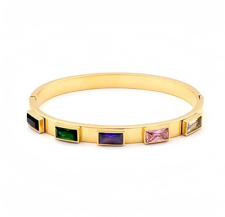 The bangle's design radiates a sense of sophistication, featuring a sleek and timeless silhouette that beautifully showcases the rectangle zircon gemstones.