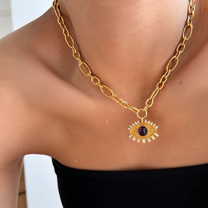 Channel your inner goddess with this Eye On It Necklace. The eye is believed to ward off negative energy and bring good fortune, making this necklace a meaningful addition to your jewelry collection.