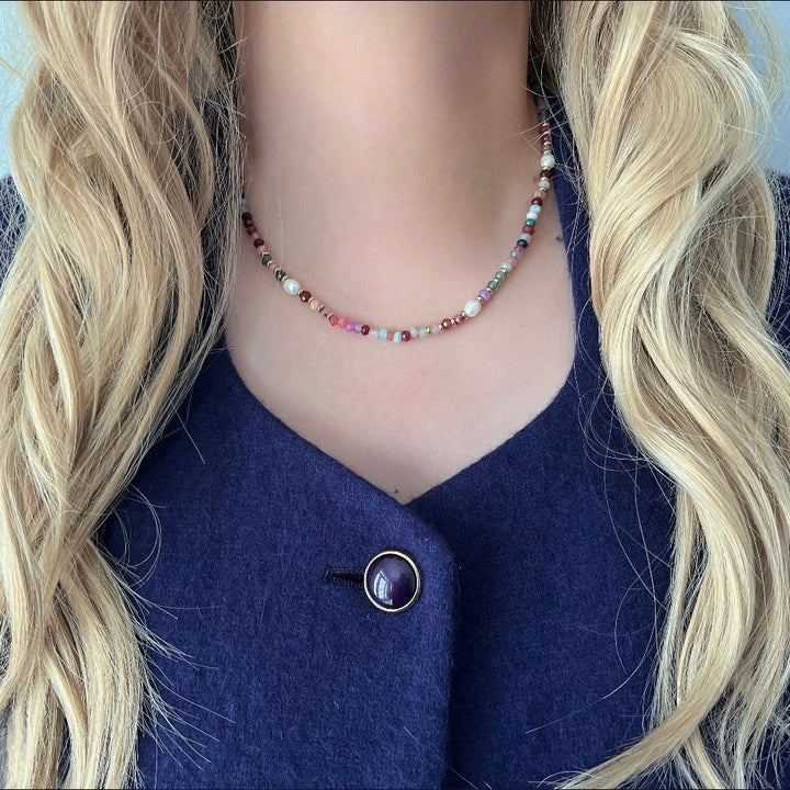 A stunning and versatile piece that beautifully showcases the rich colors and textures of various gemstones alongside the timeless elegance of pearls. This necklace seamlessly blends the vibrant allure of gemstone beads with the classic sophistication of pearls, creating an accessory that's both captivating and unique.