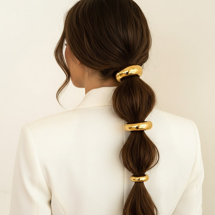 Elevate your everyday style with The Glossy Arch Pony, crafted from 14 Karat gold plating, this chic accessory not only secures your hair but also makes a bold fashion statement. Perfect for both casual outings and special occasions, this versatile hair cuff is a must-have addition to your accessory collection.
