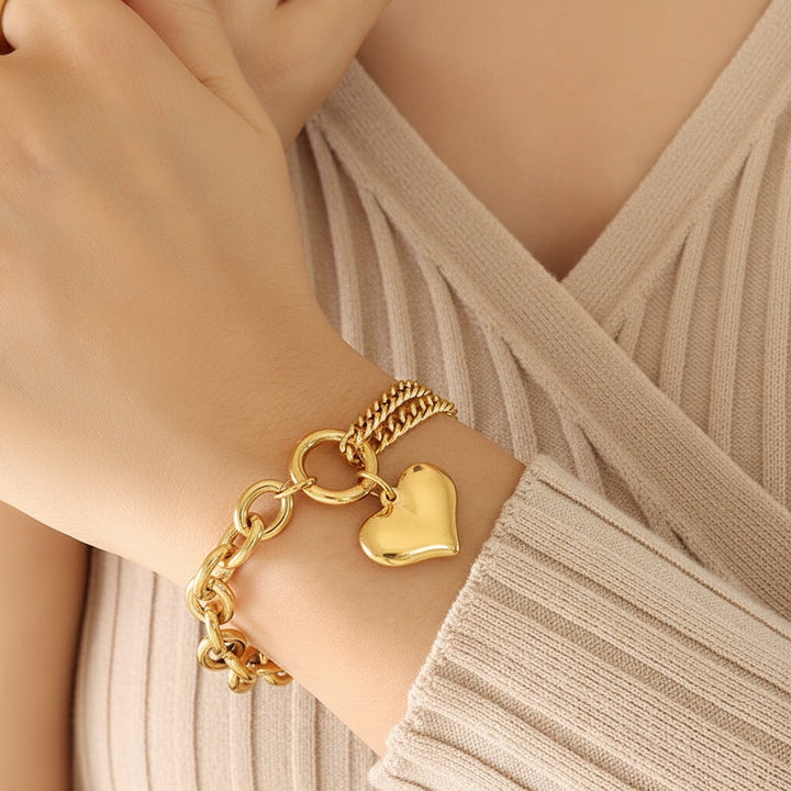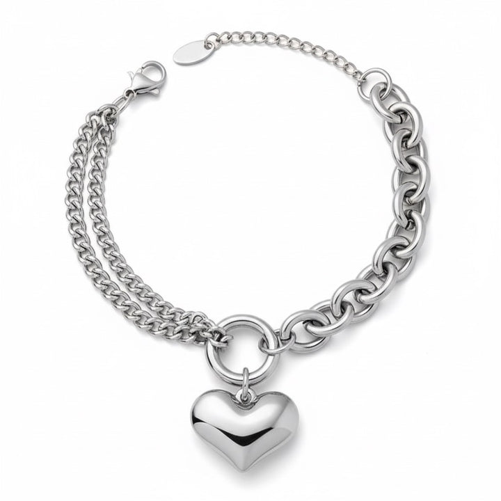 A charming and distinctive piece that beautifully combines the timeless elegance of a heart pendant with an innovative chain design featuring a single wrist chain on one side and a double twist chain on the other. This bracelet seamlessly blends the romantic allure of hearts with a modern twist.