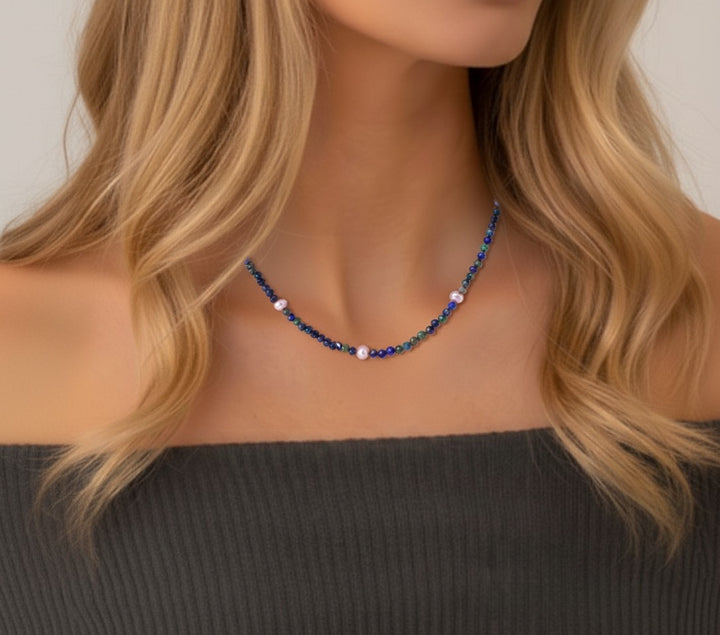Elevate your style with a stunning lapis lazuli necklace adorned with exquisite freshwater pearls.