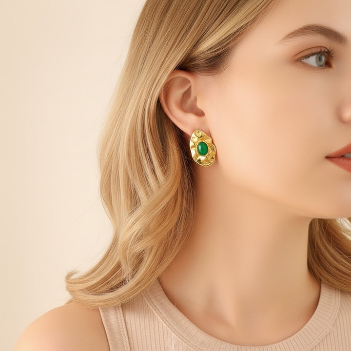 These earrings seamlessly blend the earthy charm of gemstones with the contemporary elegance of textured gold, creating accessories that are both unique and sophisticated.