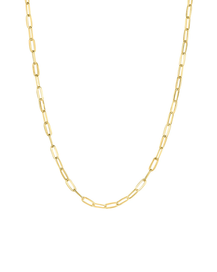This exquisite necklace features a series of interconnected paperclip-shaped links, creating a chic and minimalist design.