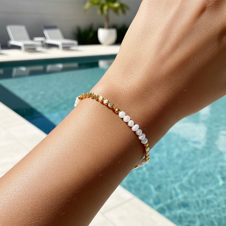 A sophisticated and timeless piece that beautifully combines the classic elegance of pearls with the luxurious charm of gold beads. This bracelet seamlessly blends the lustrous allure of pearls with the radiant shine of gold.