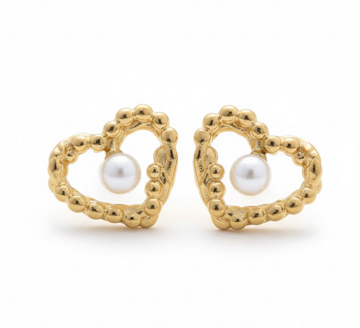 These earrings feature heart-shaped hollow designs, each adorned with a delicate glass bead at its center, evoking love and sophistication.