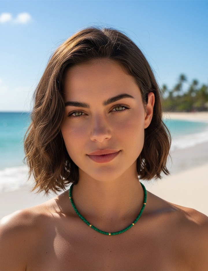 The necklace features meticulously selected malachite gemstones, each showcasing the unique and vibrant patterns characteristic of this captivating stone. Interspersed among the gemstones are lustrous gold beads that add a touch of opulence and elegance to the design.