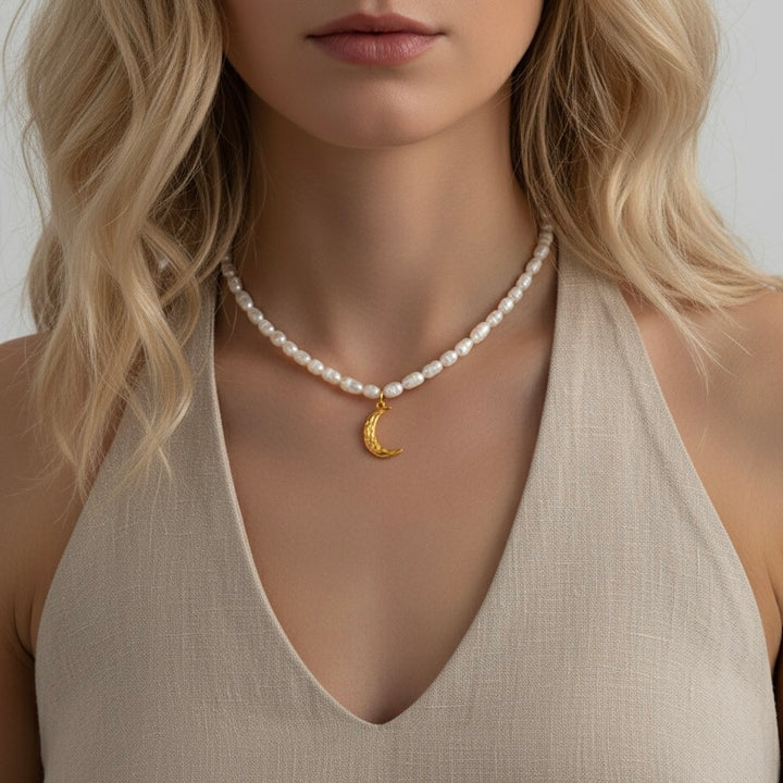 At the center of the necklace hangs a meticulously crafted golden half moon pendant. The half moon, a symbol of transition and renewal, adds an element of celestial wonder to the necklace's design. The pendant's golden glow complements the pearls' iridescence, creating a harmonious balance between earthly elegance and cosmic allure.