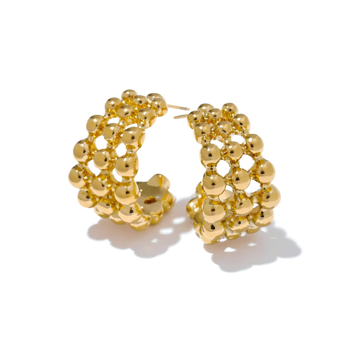 These earrings redefine the classic hoop design with a contemporary twist, featuring three lines of delicate metal bubbles that create a mesmerizing visual effect.