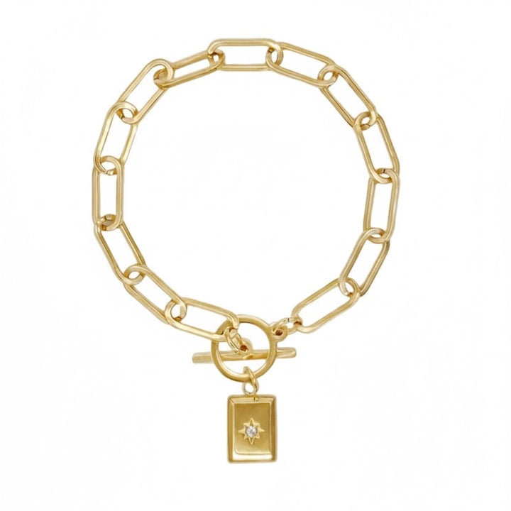 This bracelet features a contemporary paperclip chain adorned with a rectangular pendant that captures the allure of a starry night sky.
