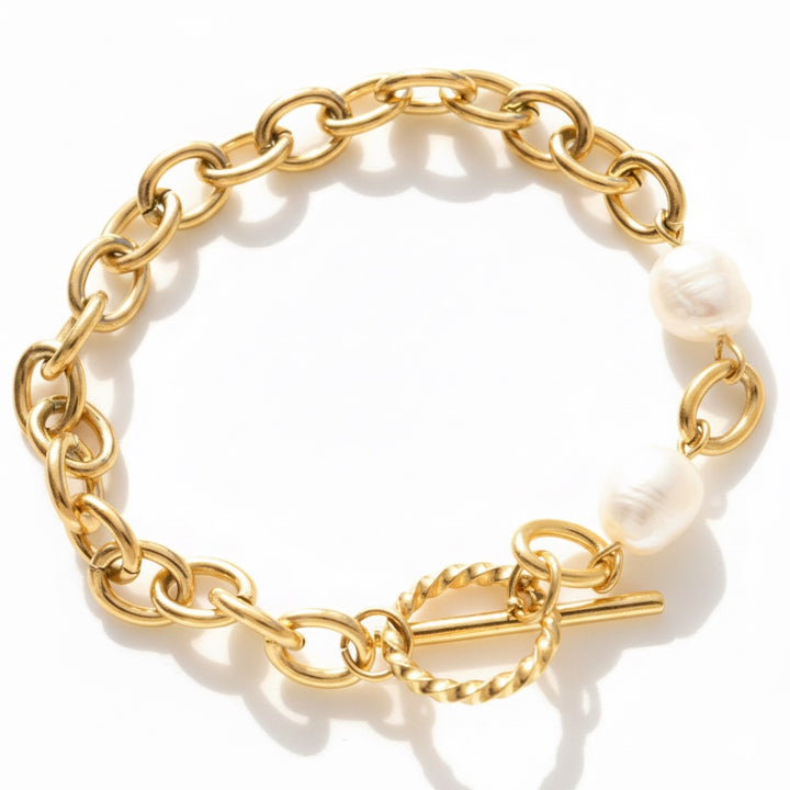 Elegant and timeless, this gold link bracelet features natural freshwater pearls and a twisted toggle clasp for a chic, elevated look. Crafted from premium stainless steel with a PVD gold finish, it’s waterproof, sweatproof, and tarnish-free — perfect for everyday wear from shower to seaside.