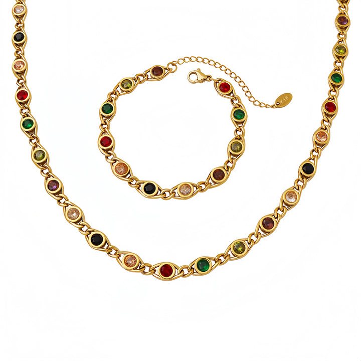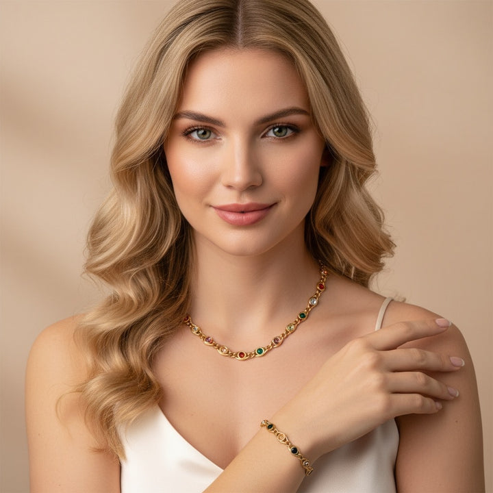 The necklace and bracelet feature a sequence of gold link chains adorned with multi-color zircon gemstones, meticulously arranged to create a captivating and eye-catching pattern. Each link showcases a different shade of zircon, creating a rainbow of colors that exudes energy and positivity.