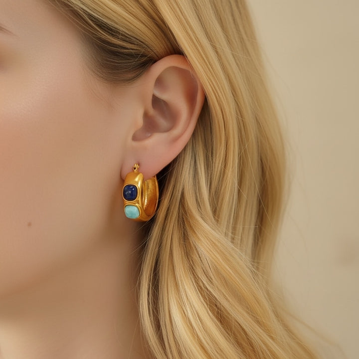 Each earring features a hoop design that gracefully frames your face, creating an understated yet eye-catching effect. Adorning the hoops are two turquoise gemstones, carefully chosen for their vibrant color and exquisite texture.