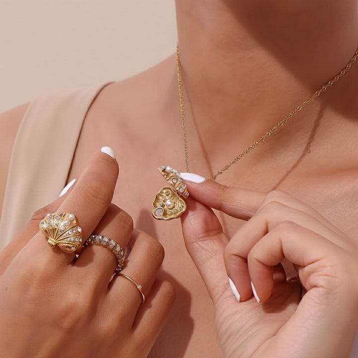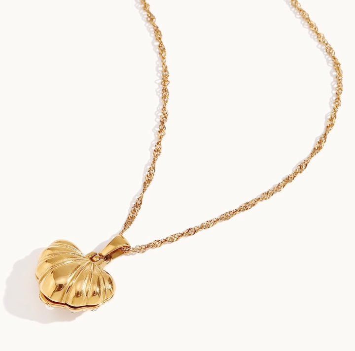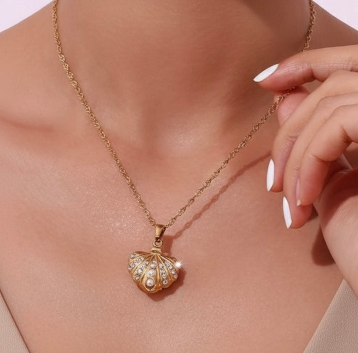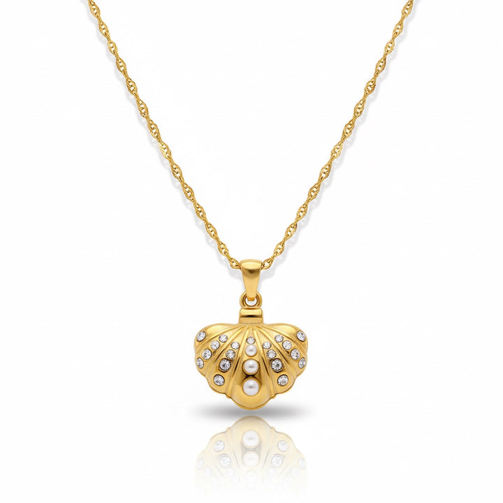 Embrace the beach life with this stunning Gold Shell Necklace. It's 100% waterproof, sweatproof, and tarnish-free, meaning you can wear this elegant piece of beachy jewelry in the ocean, pool, and shower without worry. Featuring a beautifully crafted shell pendant adorned with crystals and pearls, it's the perfect ocean proof staple for everyday wear.