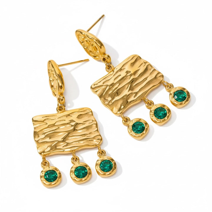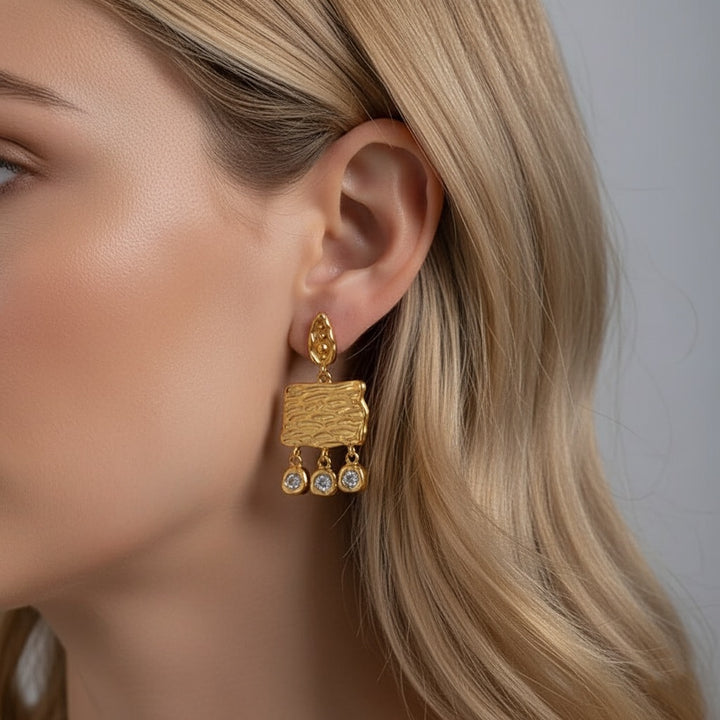 These earrings blend geometric forms with the allure of sparkling gems, creating a harmonious interplay between structure and radiance.