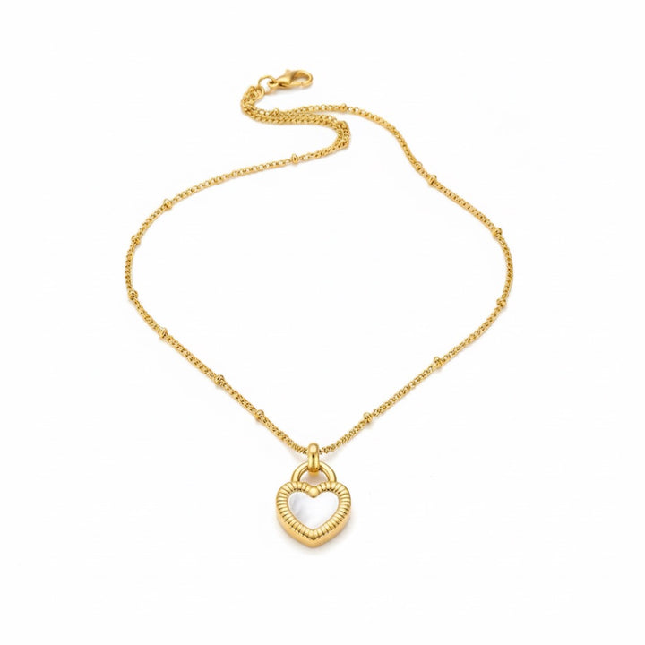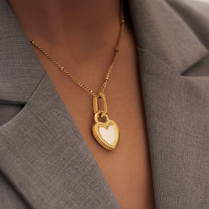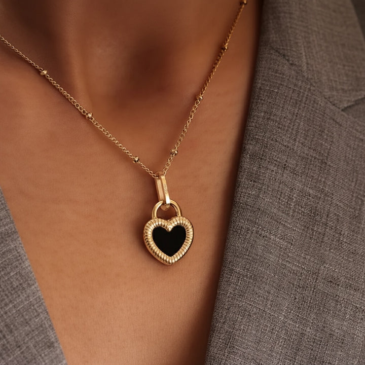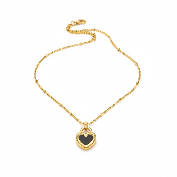 This charming gold necklace features a reversible heart pendant: one side a sleek black, the other a delicate white, both framed in ribbed gold. It's a versatile piece, perfect for any style.