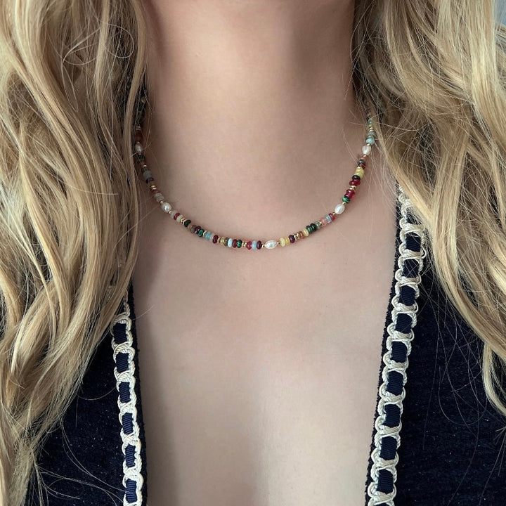 Natural Gemstones: Each necklace is completely unique, threaded with pieces of Freshwater Pearl, Malachite, Moonstone, Garnet, Crystal Apatite, Amethyst, Amazonite, Rose Quartz, Turquoise, Orange Carnelian, Pink Opal, Green Onyx, Lemon Quartz, Blue Lace Agate, Peruvian Opal,Lapis, Tourmaline,Rhodonite and Blue Quartz