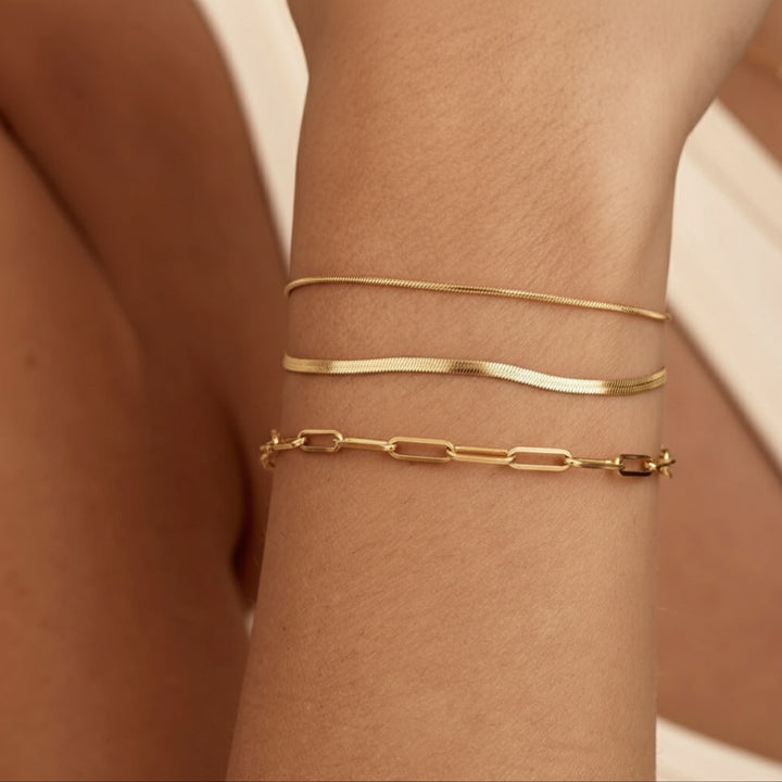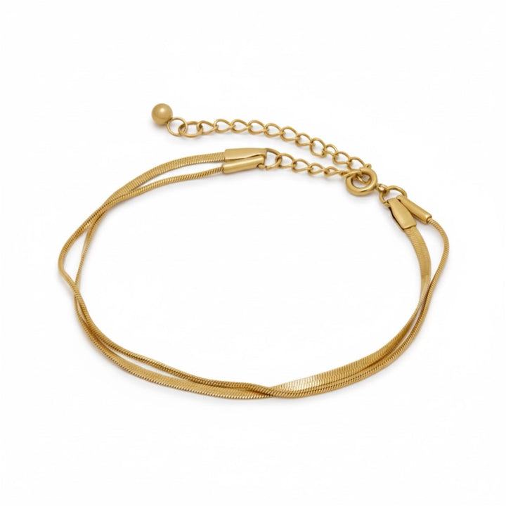 The bracelet features two sleek and slender chains that run in parallel, exuding a sense of symmetry and balance. The clean lines and smooth surfaces of the chains contribute to the bracelet's minimalist aesthetic, making it a versatile piece that can be worn on its own or layered with other favorites.