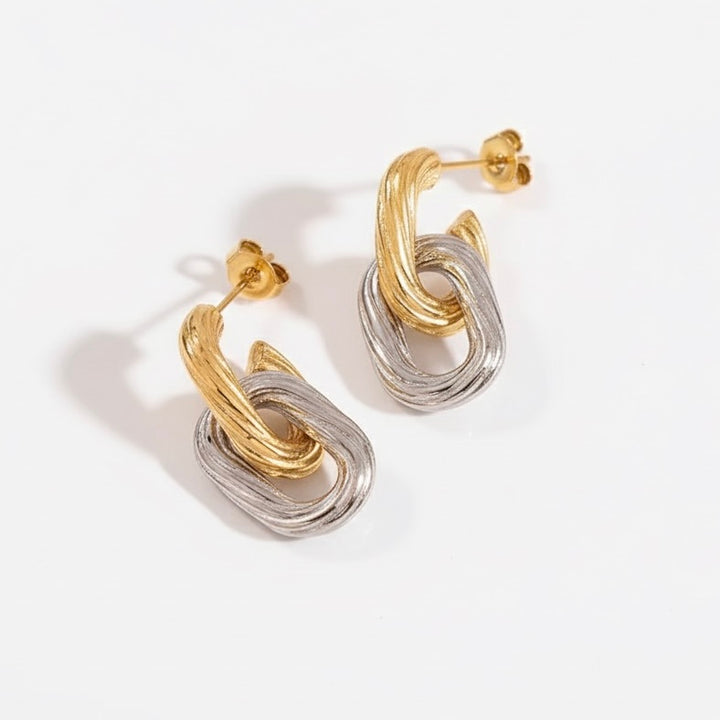 The earring features meticulously crafted interlocking chains, with alternating links in gold and silver tones. This unique combination adds a touch of contemporary charm and creates a harmonious balance between the two precious metals.